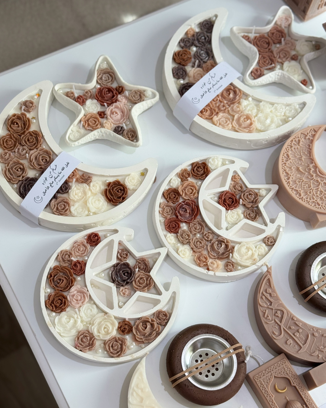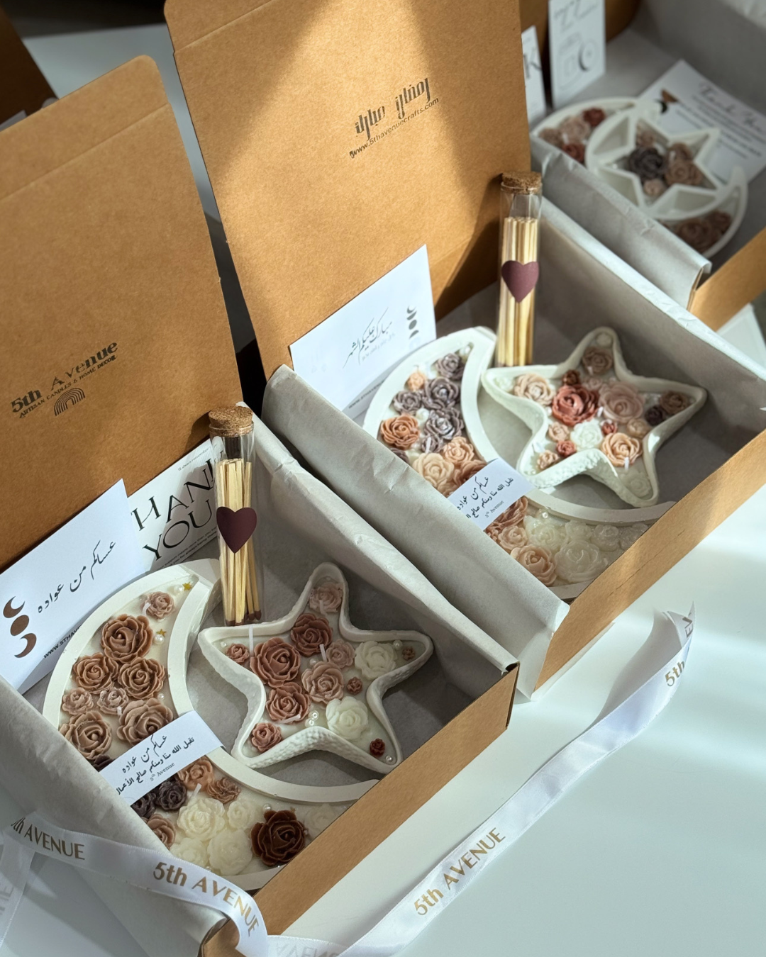 علبة هدايا رمضانية فاخرة تضم شموعًا مصنوعة يدويًا من شمع الصويا النقي ١٠٠٪. تتميز بتغليفها الأنيق ورائحتها العطرة، وهي هدية خالدة لنشر الدفء والبركات في هذا الشهر الفضيل